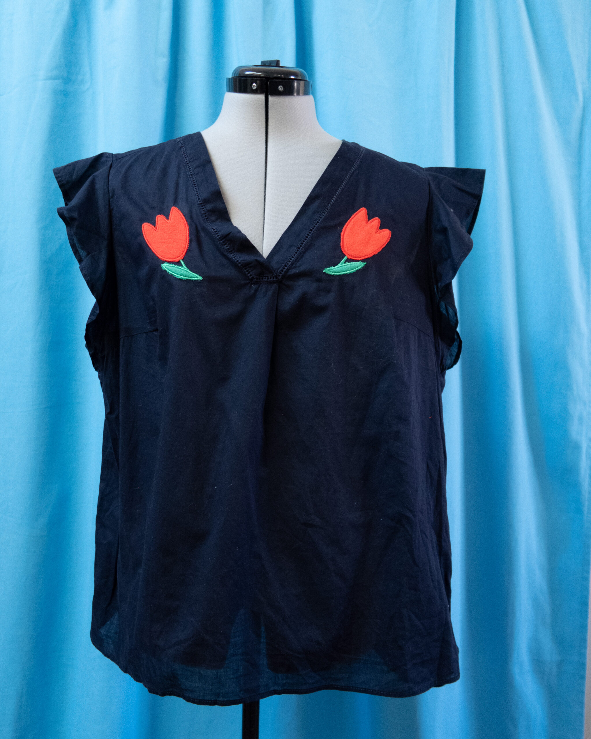 Top volanté avec pinces à la poitrine. Matière légèrement transparente.